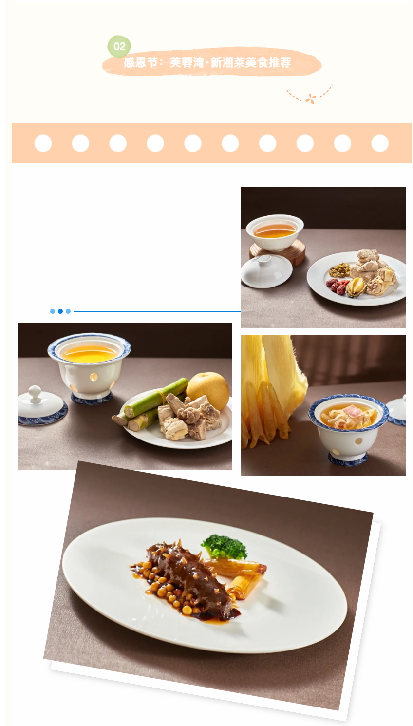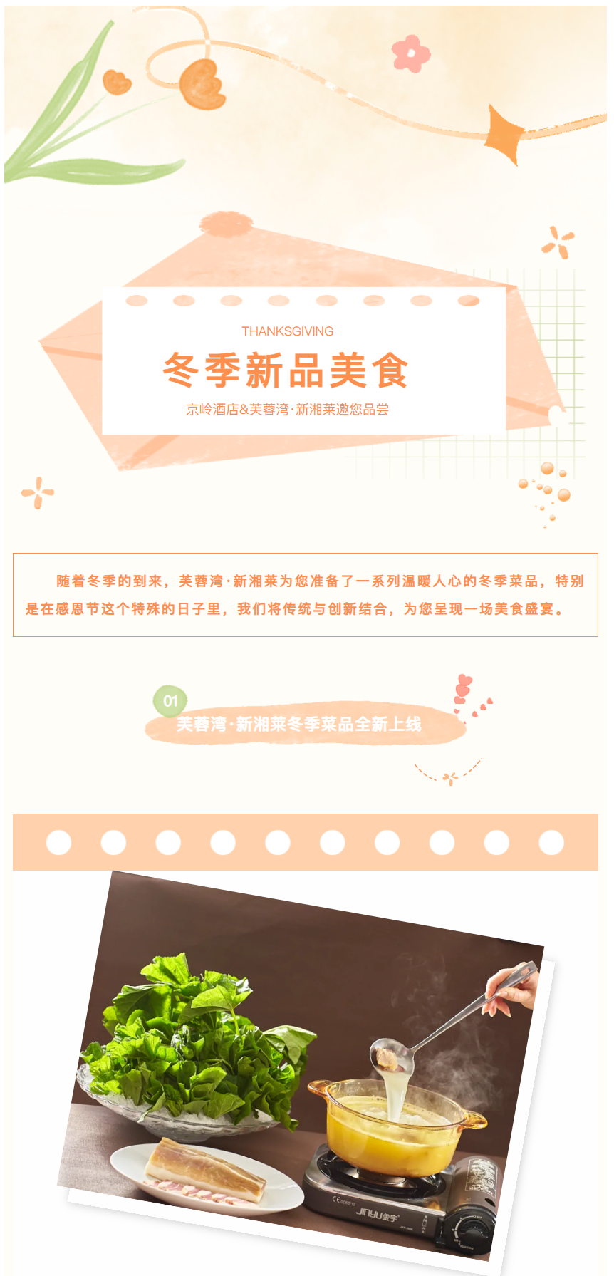 【概要描述】 隨著冬季的到來,芙蓉灣·新湘萊為您準(zhǔn)備了一系列溫暖人心的冬季菜品,特別是在感恩節(jié)這個特殊的日子里,我們將傳統(tǒng)與創(chuàng)新結(jié)合,為您呈現(xiàn)一場美食盛宴。