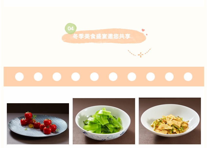 我們的冬季美食盛宴將持續(xù)整個冬季,讓我們一起在這個溫暖的氛圍中,共同享受美食帶來的快樂與幸福。