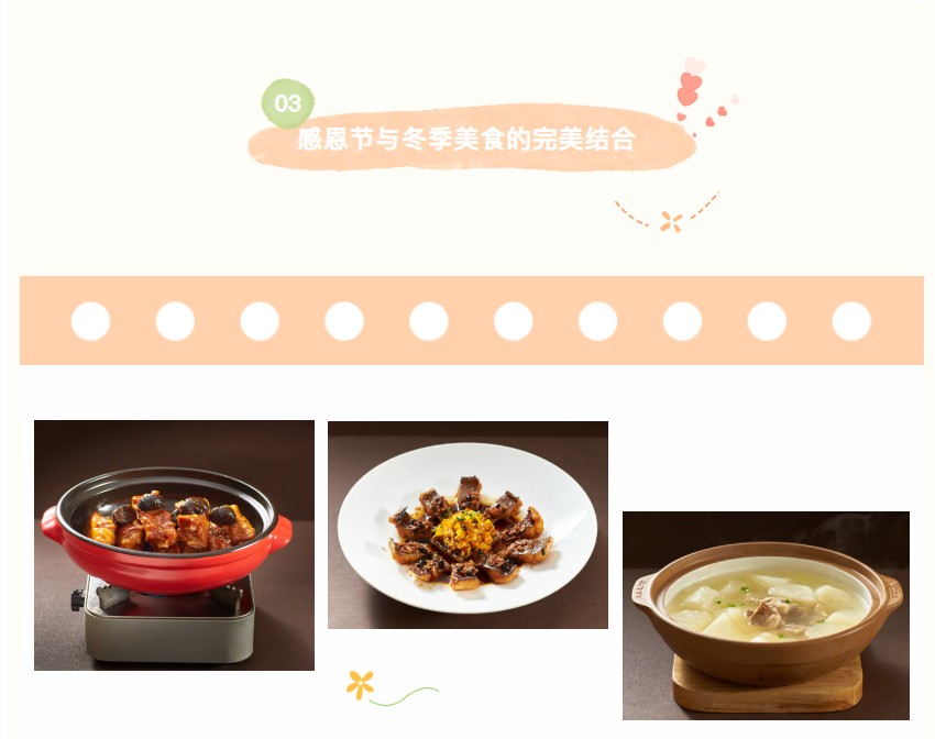 感恩節(jié)與冬季美食的結(jié)合,是對傳統(tǒng)節(jié)日的一種全新詮釋。在芙蓉灣·新湘萊,我們將這兩者完美融合,為您呈現(xiàn)出獨(dú)特的節(jié)日菜單。每一道菜品都蘊(yùn)含著對生活的熱愛與感激之情。